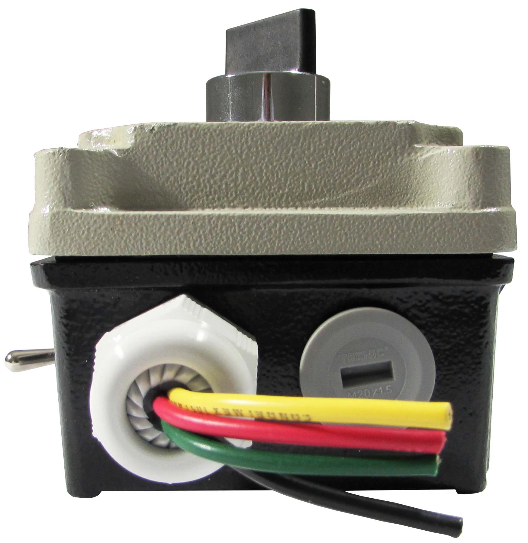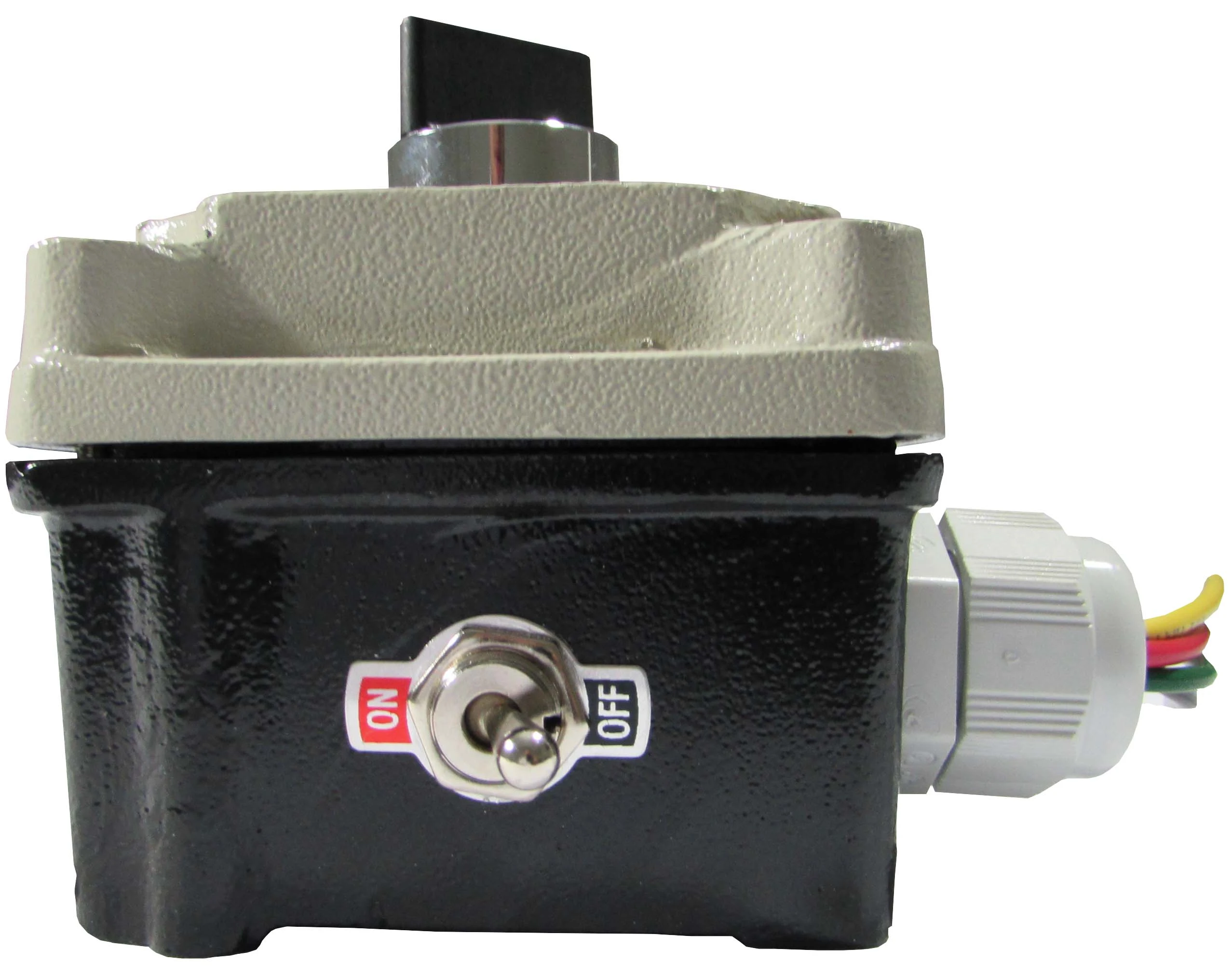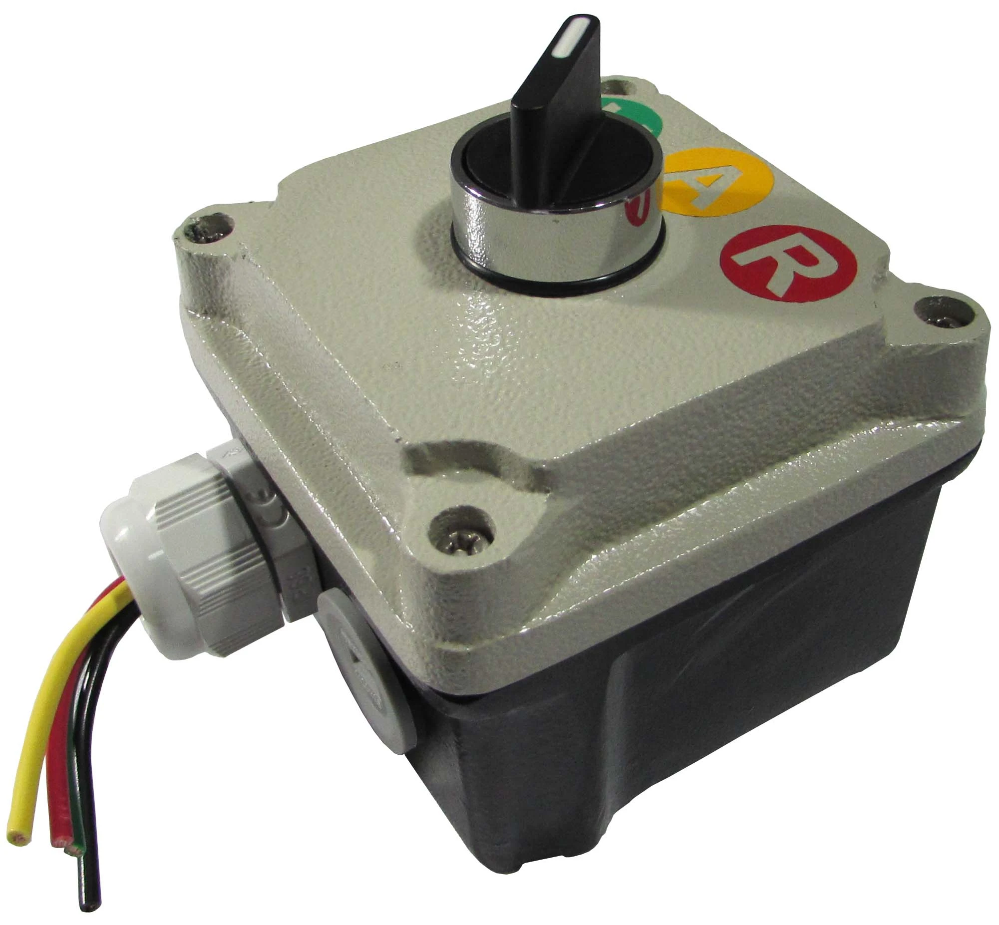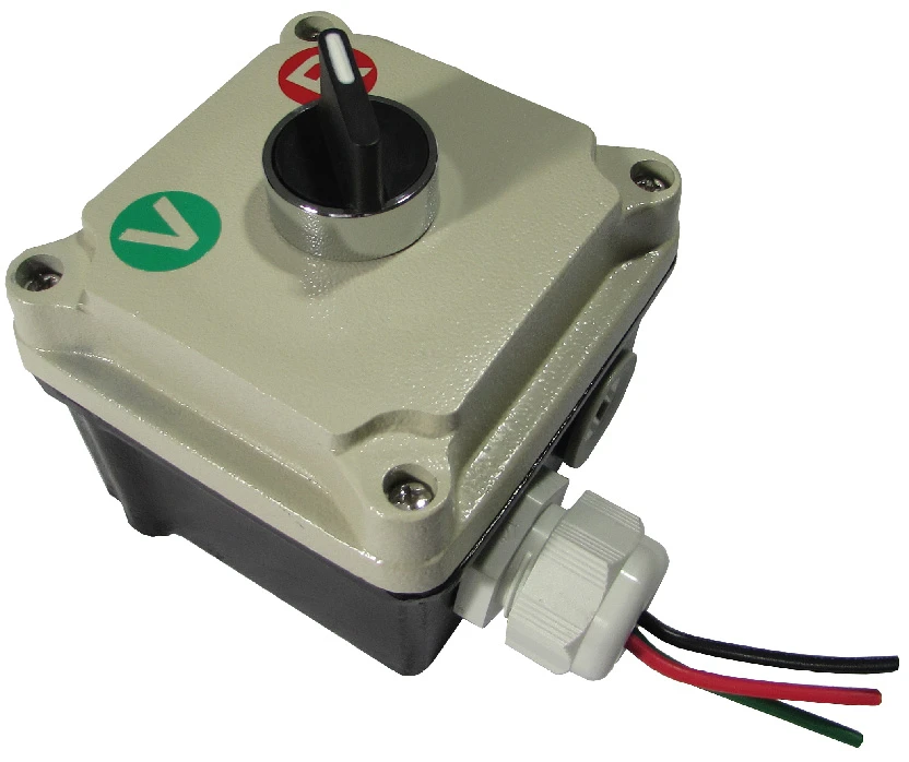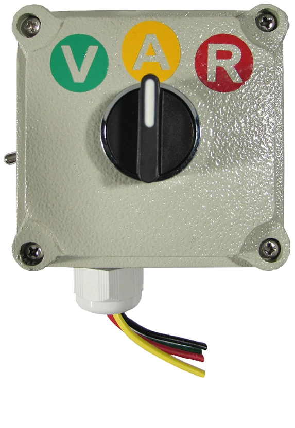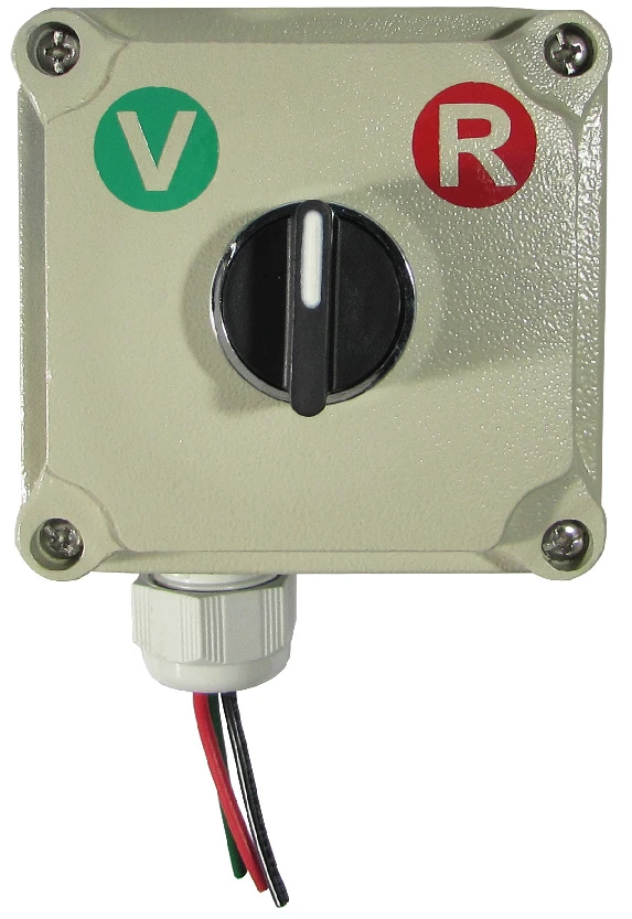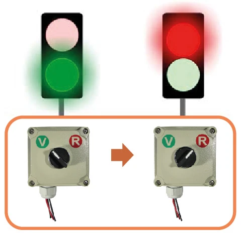 Este sencillo sistema consta de un selector de 2 ó 3 pasos mantenidos, el cual está montado dentro de una caja metálica. Al girar la perilla el sistema acciona el color de lámpara del semáforo que se encenderá. El selector puede ser usado también en semáforos de todos nuestros modelos y en versiones de dos o tres lámparas.