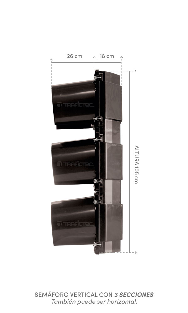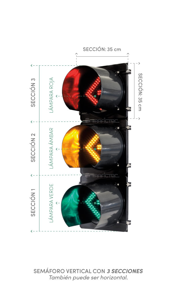 3. Elija la orientación del semáforo. Puede ser vertical u horizontal de acuerdo al espacio donde sera instalado. Este semáforo se puede combinar con lamparas solidas de 30 cm, Ver ejemplo en Semáforo 30 cm. |